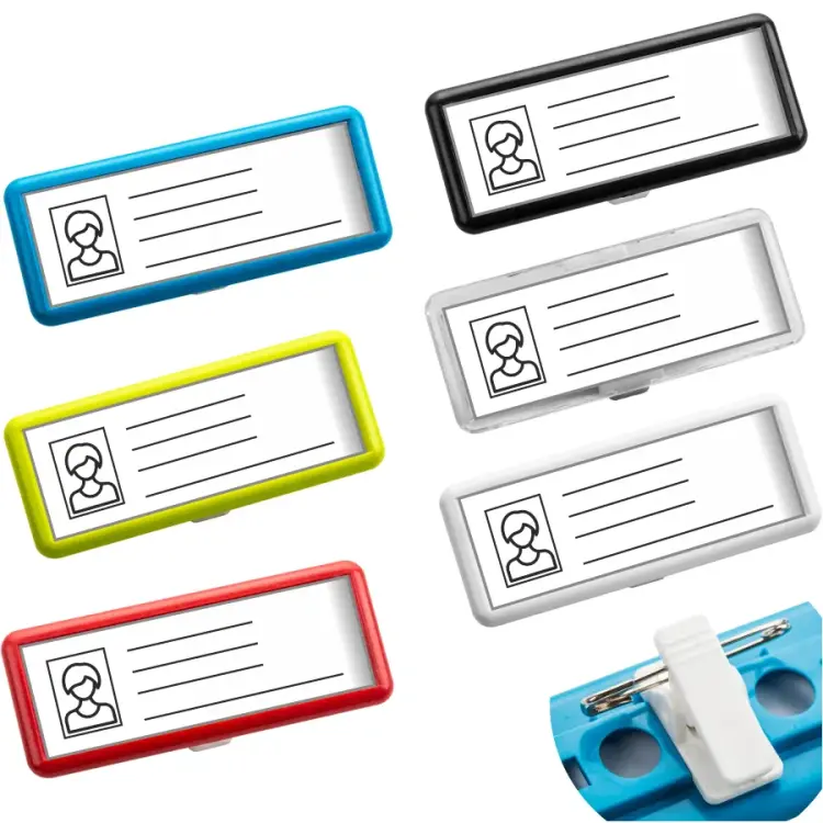 Moderní plastová jmenovka o rozměru 70×25 mm s pojistným špendlíkem a svorkou krokodýl pro snadné uchycení. Jmenovka je vybavena PVC průzorem a výřezem na zadní straně, který usnadňuje výměnu štítku.
